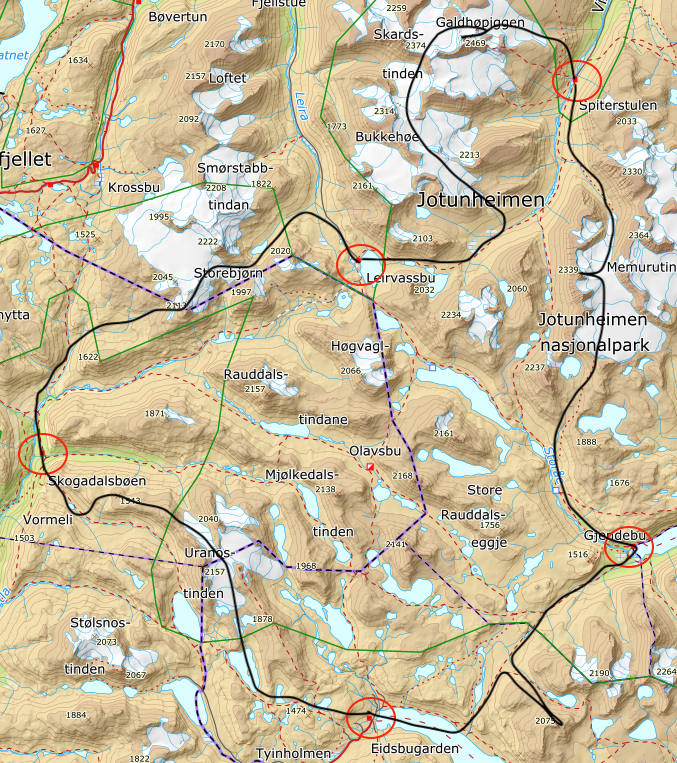 Vi starter med å følge kvisteløypa mot Krossbu. Etterhvert svinger vi av mot høyre og går opp på Gravdalstinden (2113). Her nyter vi utsikten før vi tar oss ned Sandelvbreen, gjennom Glupen og videre til Leirvassbu.