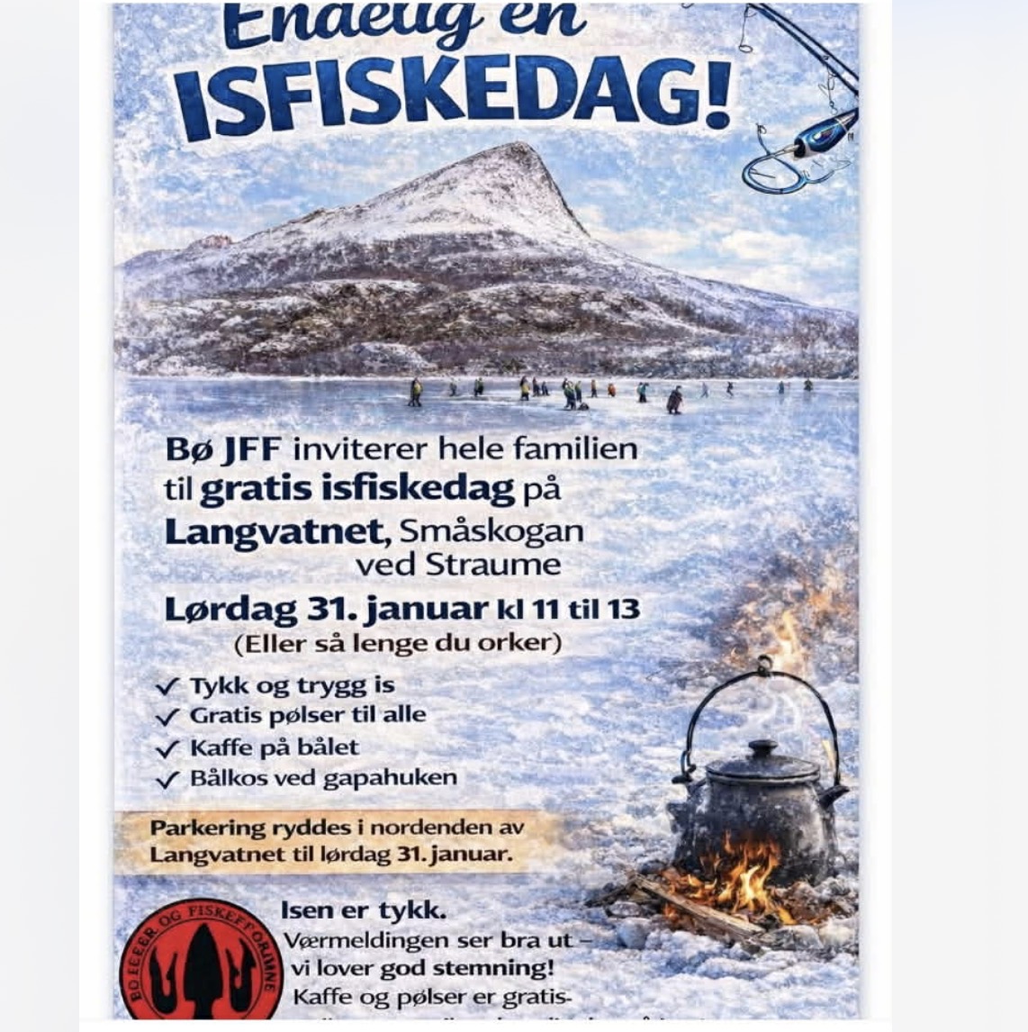 Ta med hele familien på isfiske! Det blir båling, kaffekos og gratis pølser og kaffe til alle!