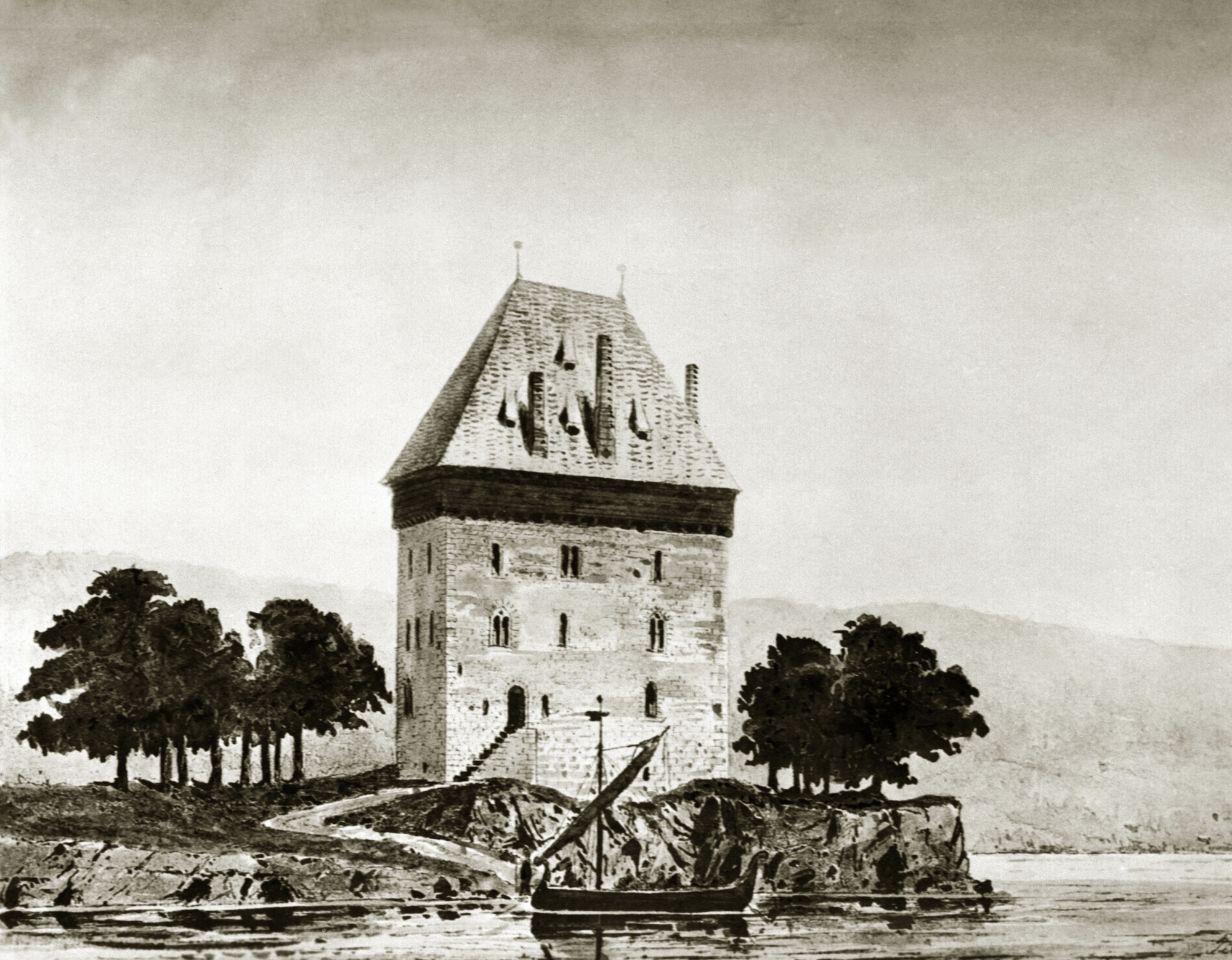 Bildet over er en rekonstruksjon av Mjøskastellet av Peter Blix / Domkirkeoddens Fotoarkiv, Digitalt Museum.