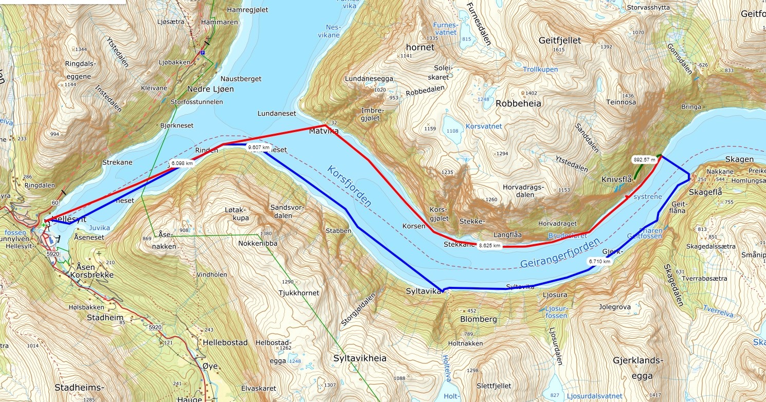 Frå Hellesylt går turen først til Syltavika, ein tur på om lag 10 km. Her går vi i land for ei lita pause og påfyll av energi. Frå Syltavika går turen vidare innover fjorden via fossen Friaren, der moglegheita for å verte våt i håret er stor. Vi padlar vidare til Skagehola og legge får oss kajakkene og går opp til Skageflå, her tek vi dagens hovudpause med god utsikt. Strekket frå Syltavika til Skagehola er på om lag 6 km. Turen frå Skagahola til Skageflå er om lag 1 km og 200 høgdemeter. Ta med ekstra sko for denne turen.
