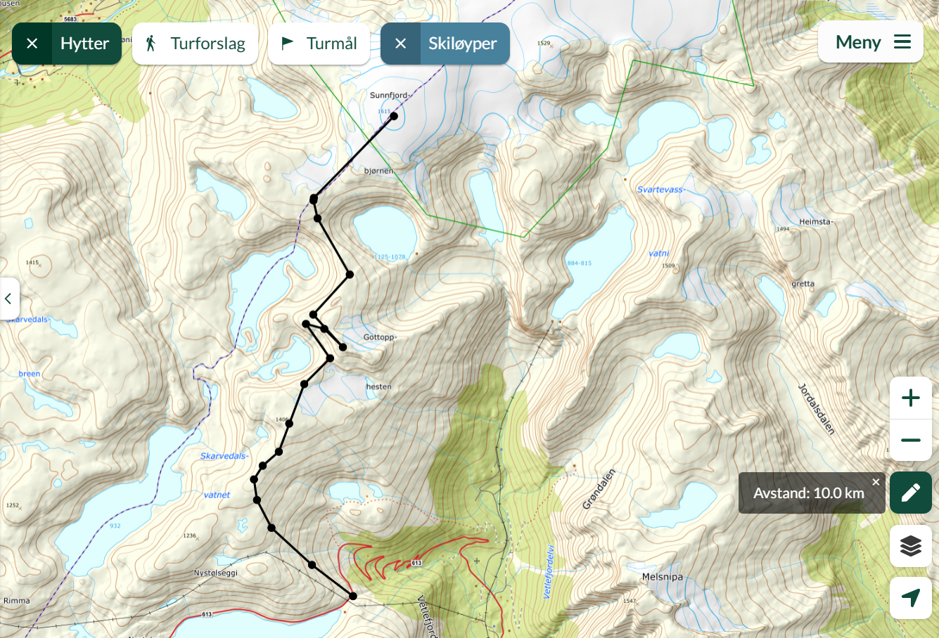 Ruta er totalt 22 km lang, og kjem opp i kring 1900 høgdemeter stigning. Vi brukar truleg 9-10 timar på turen inkl gode pausar. Skjermbilete visar ca ruteval, men vi må tilpasse vêr og føre. Turen går berre i godt vêr.