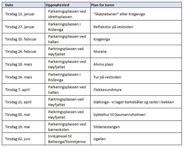Her møtes barnefamilier med barn fra omtrent 4-10 år for å ha det gøy sammen ute i naturen, spise kveldsmaten rundt bålet, leke, og av og til lære noe nytt om enkelt friluftsliv. Vi møtes ulike steder på Flekkerøy annenhver tirsdag fra kl. 17.00-18.30. Barna må komme sammen med en voksen. Man kan ha med seg vanlig niste eller mat som kan varmes på bål/primus. Påmeldte får mer informasjon.