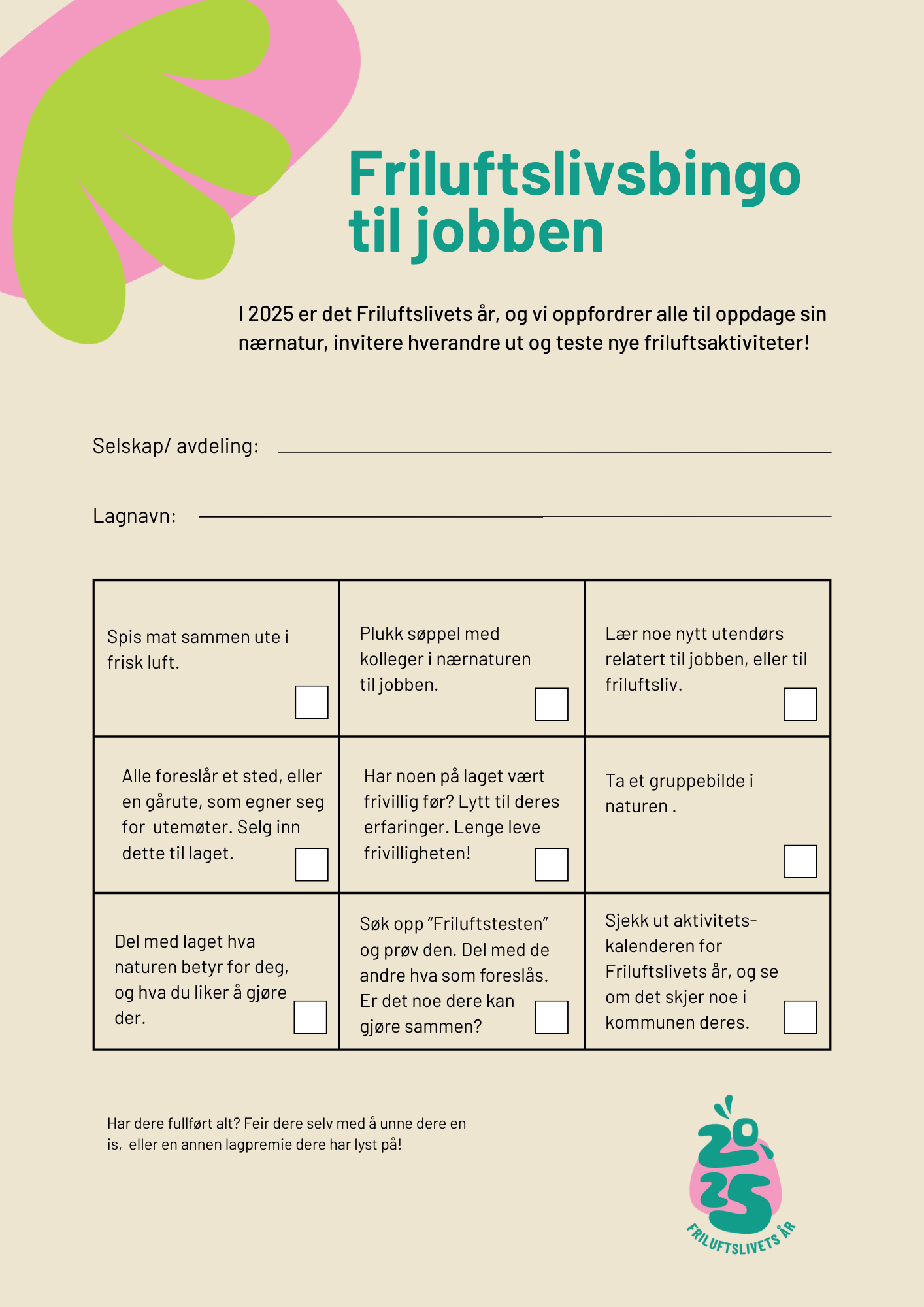 - Prøv Friluftslivsbingo på jobben (pdf): Ni aktiviteter du kan skrive ut, henge opp og løse med kolleger. Dette kan dere løse over tid.
